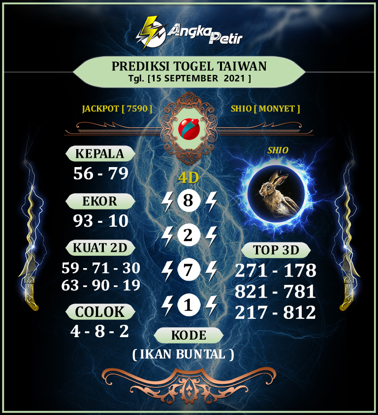 Angka Petir Pasaran TAIWAN 12 SEPTEMBER 2021 Angka Petir:0534 Shio:monyet Bergabung di grup Telegram kami @angkapetir8 Prediksi Lengkap Lainnya bisa. Angka keluar hasil togel taiwan live result sabtu 25 februari 2023, nomor keluar hasil togel taiwan live result hari ini. Kode Syair Taiwan 25 Februari 2023 Angka Main Taiwan = 68072 Angka Jitu Taiwan =.